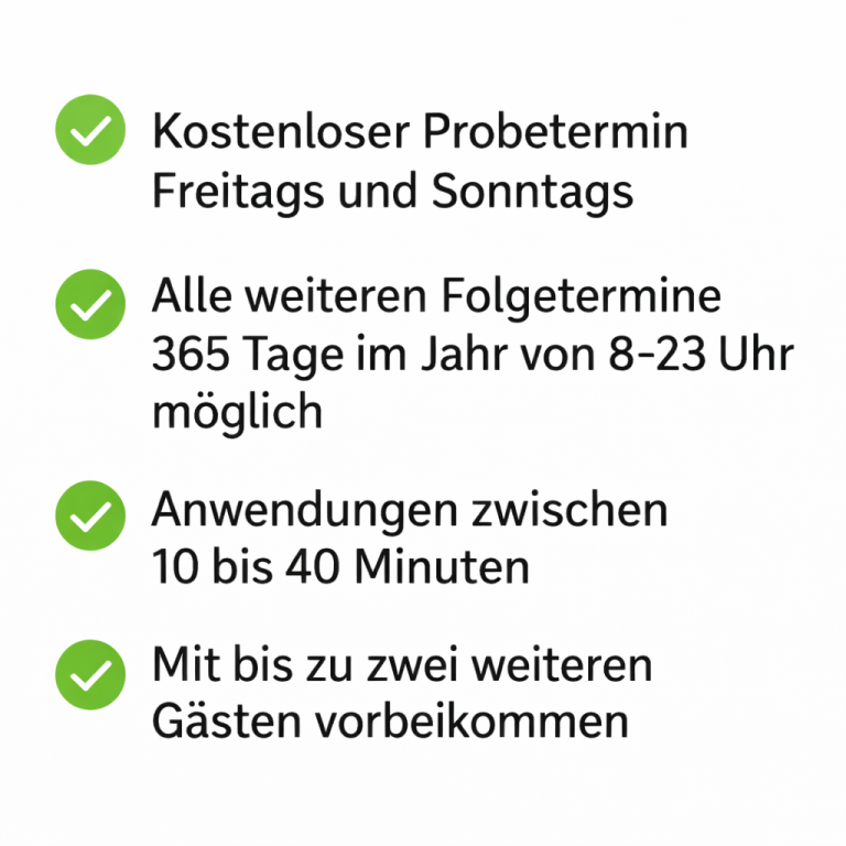 Kostenlos testen an zwei Tagen die Woche. Weitere Anwendungen können eigenständig an 365 Tagen im Jahr zwischen 8-23 durchgeführt werden.